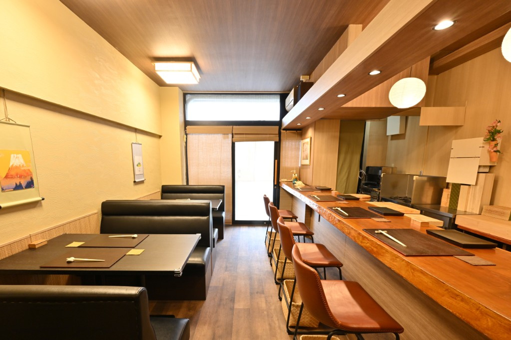 店内は落ち着いた雰囲気で、BGMに古いジャズのレコードをかけています。肩肘張らずにこだわりのお鮨をお召し上がり頂けます。